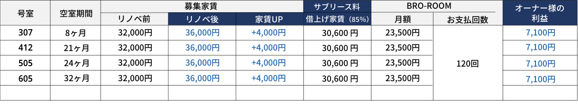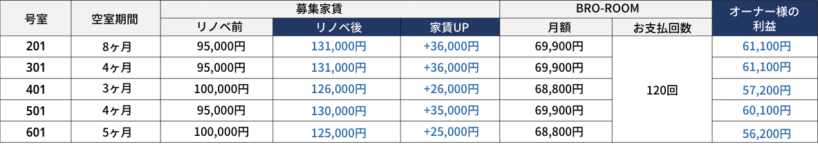 BRO-ROOM工事後から収支があがり、空室も出てないので、満足しております。